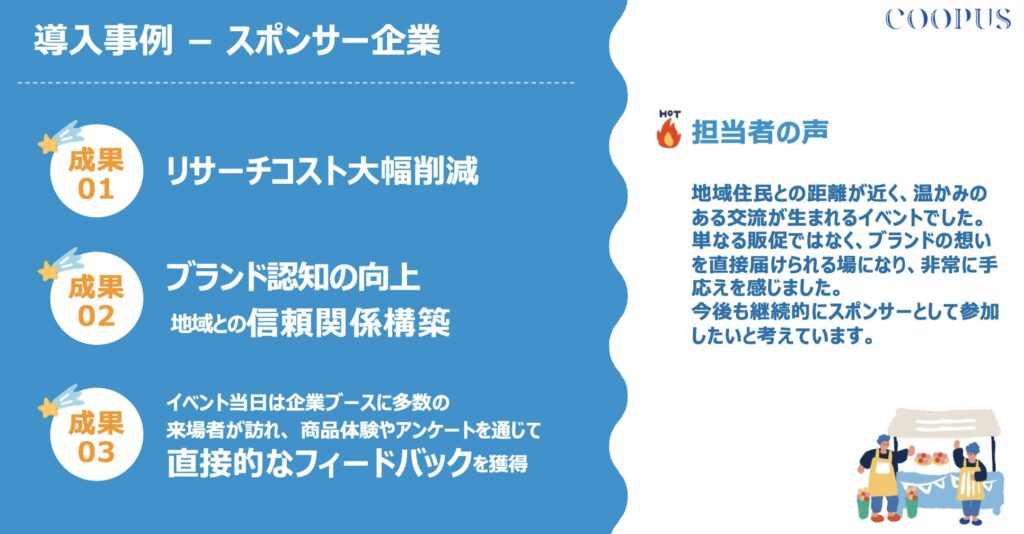 協賛を通じて、来場者と直接会話をする機会が生まれ、商品やサービスに対する率直な反応を得ることができました。