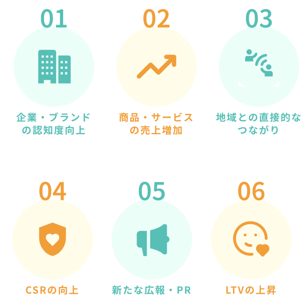 企業がイベント、チーム、個人などに資金やリソースを提供し、その見返りとしてPR・宣伝活動を行うことができます。これにより、スポンサーはブランド認知度の向上や、特定の人たちに対するアプローチやコミュニケーションの方法を図ることができます。